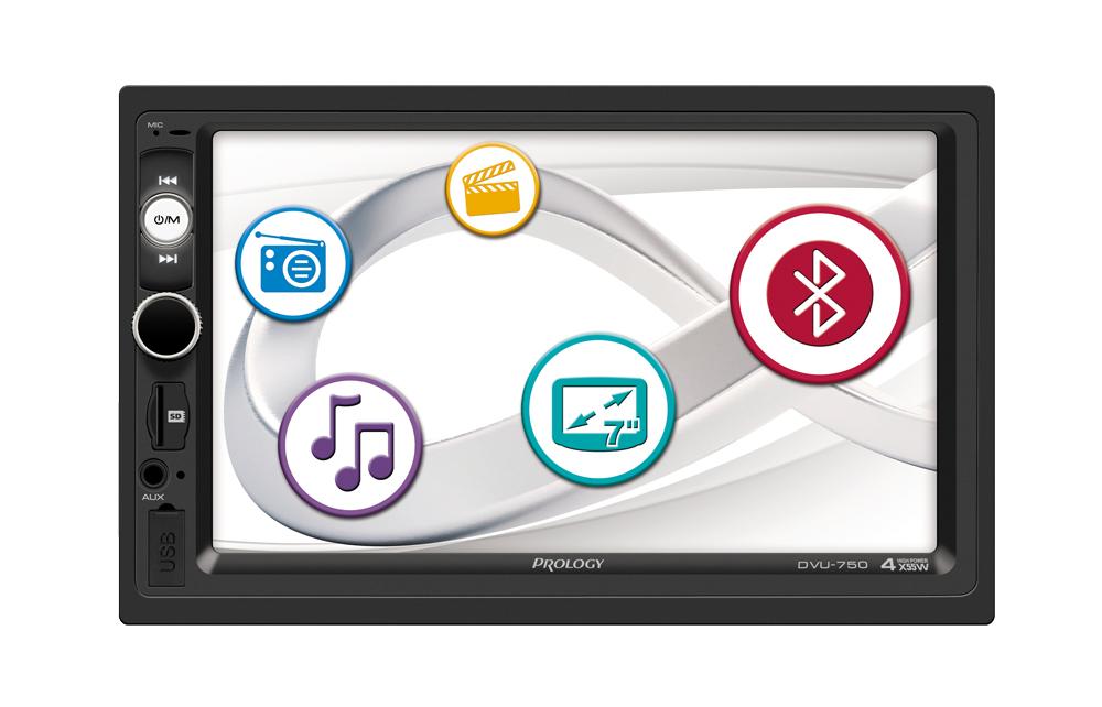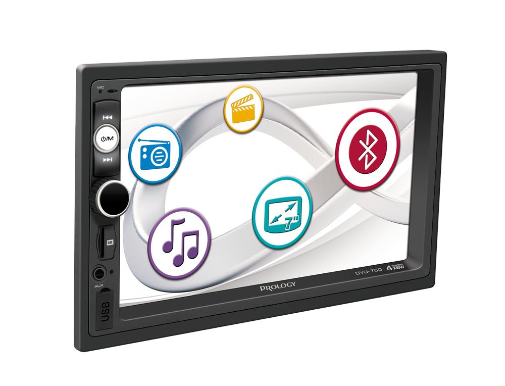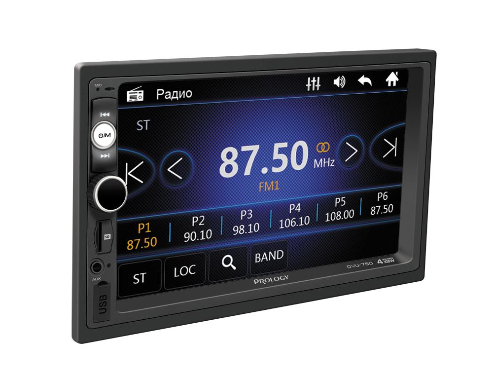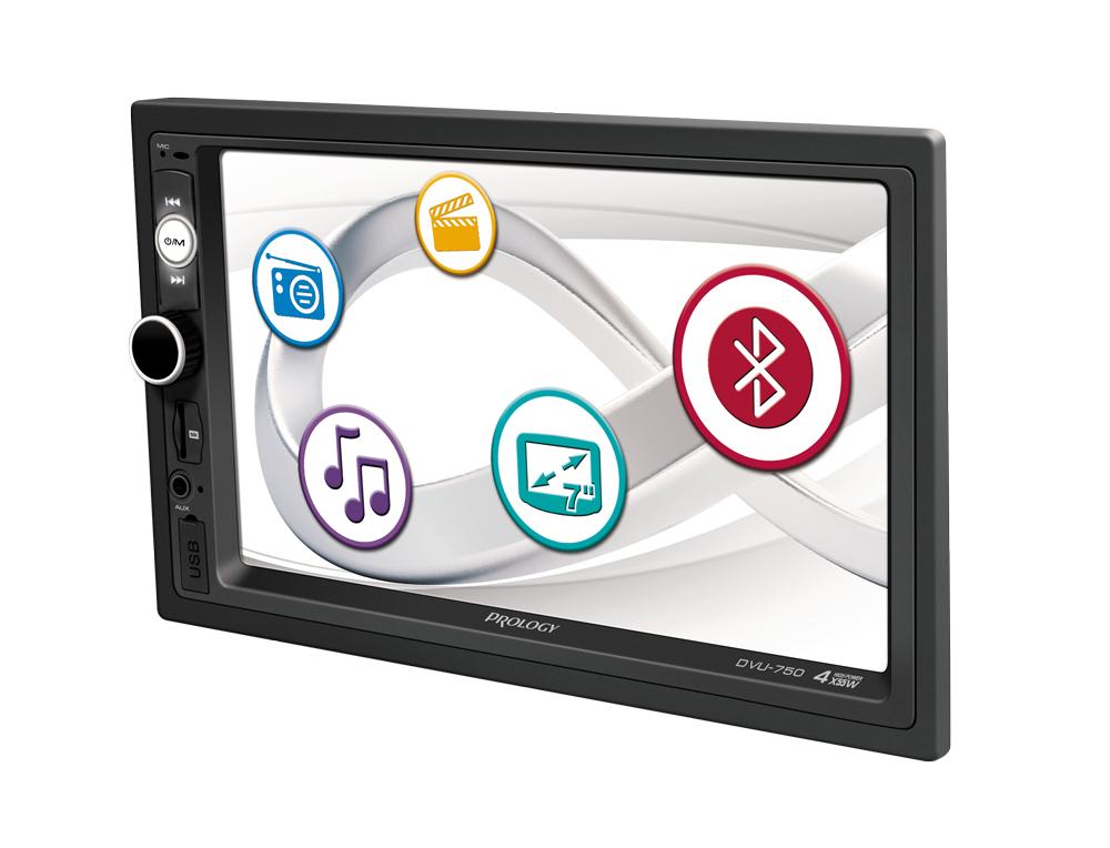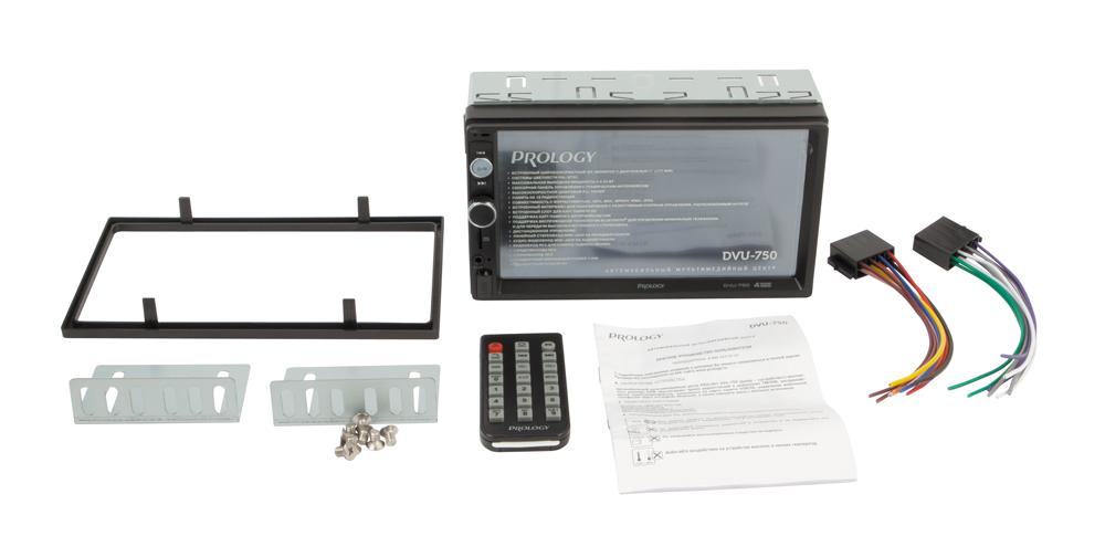 Prology DVU-750 монтажного размера 2DIN обеспечивает прием радиостанций в диапазонах FM/УКВ, воспроизведение аудио/видеофайлов, записанных на карты памяти