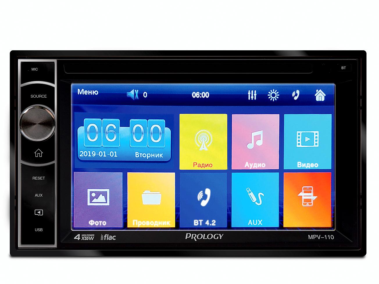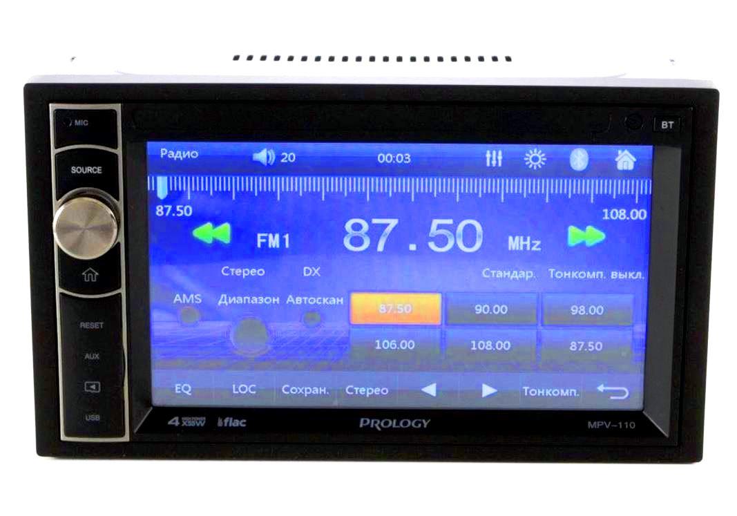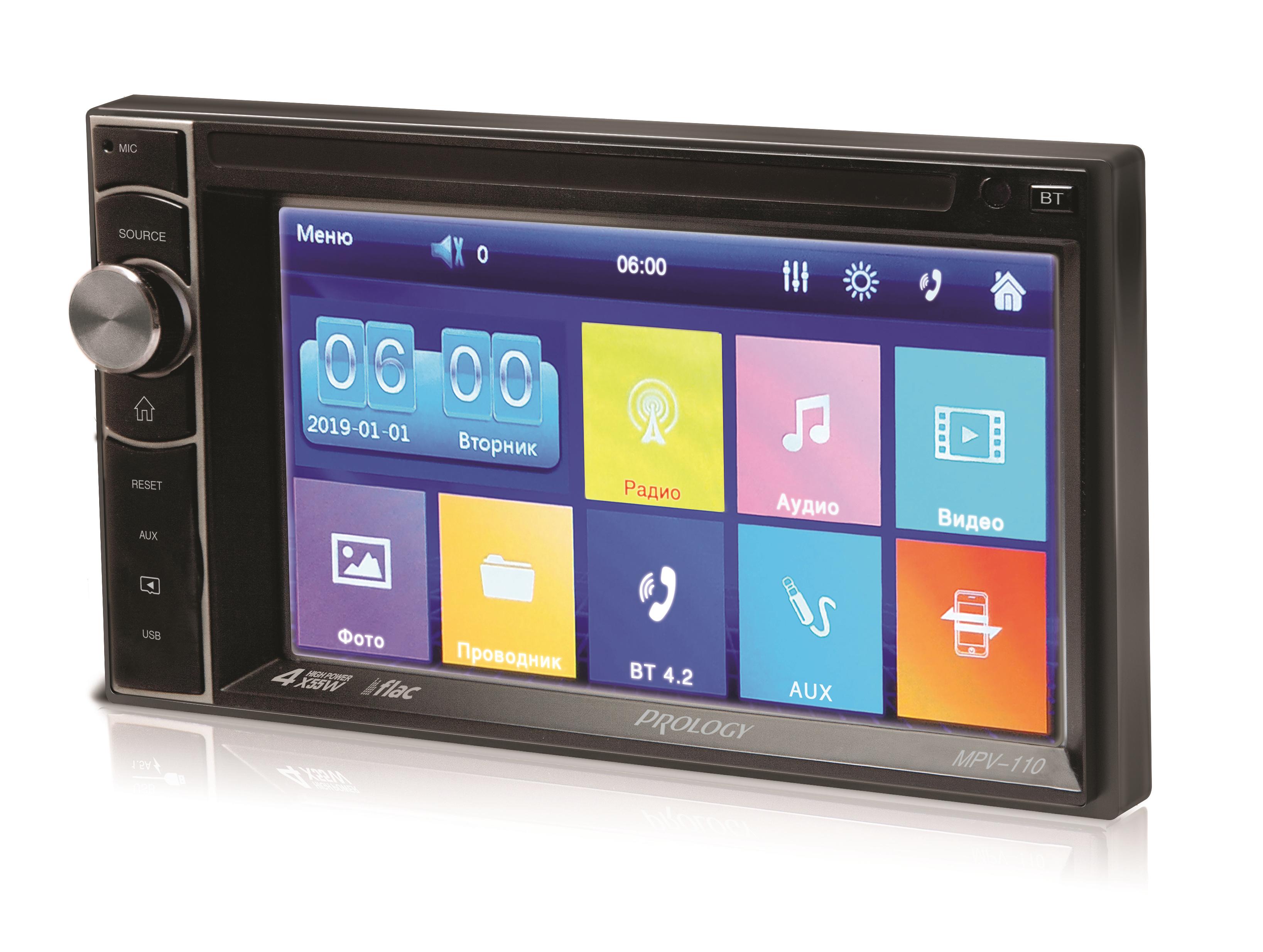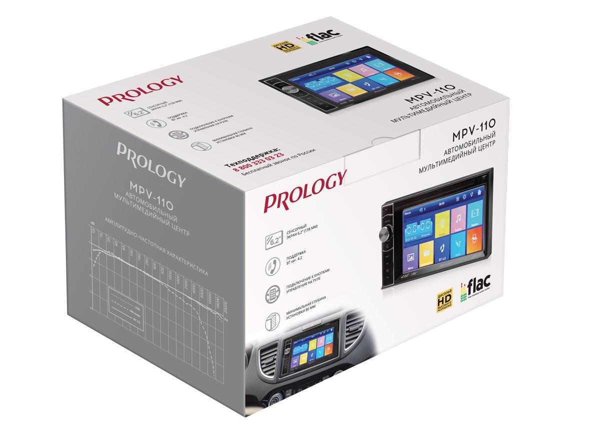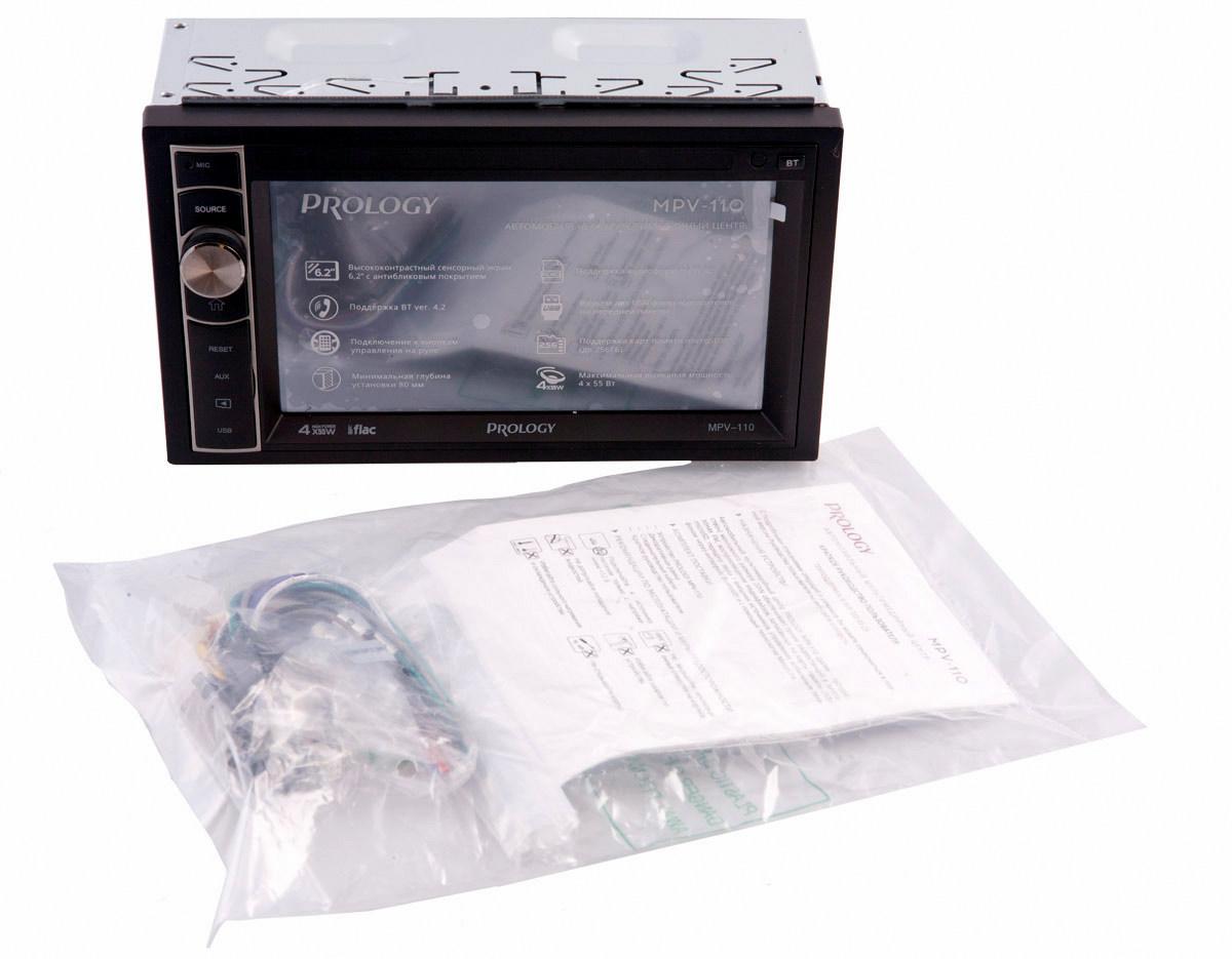 Автомобильный мультимедийный центр PROLOGY MPV-110 монтажного размера 2DIN обеспечивает прием радиостанций в диапазоне FM, воспроизведение медиафайлов, записанных на карты памяти USB / microSD, передачу звука с внешних источников, а также управление мобильным телефоном через интерфейс Bluetooth (version 4.2).
