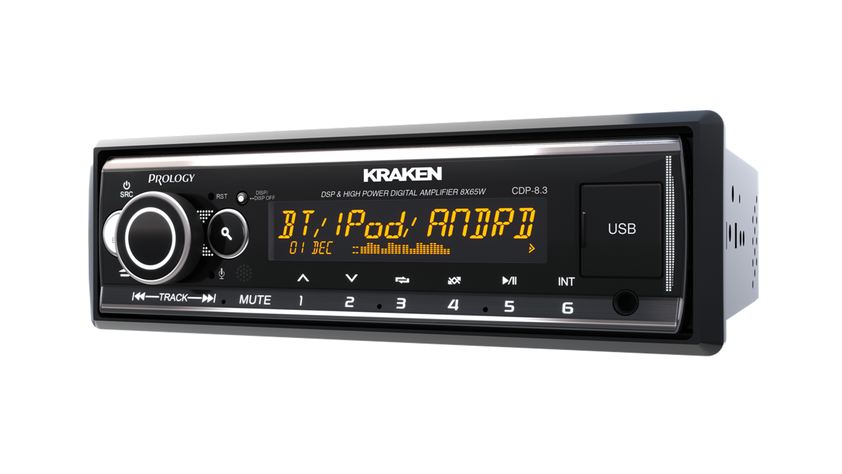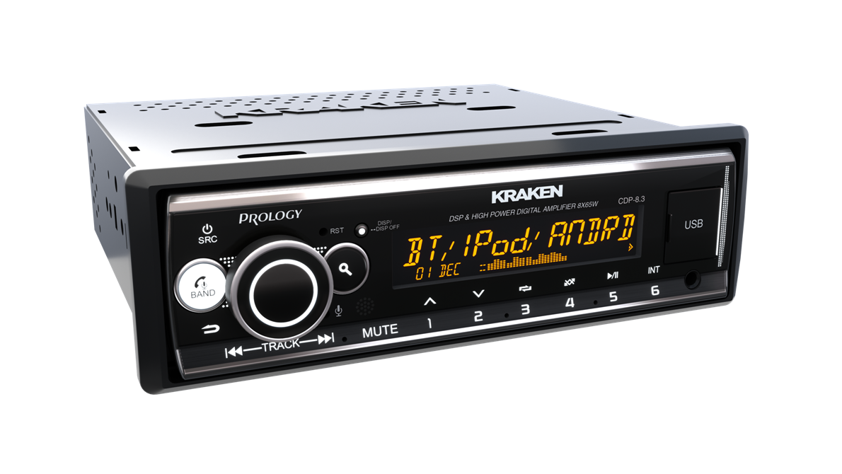PROLOGY CDP-8.3 KRAKEN — FM / USB ресивер с Bluetooth® и встроенным DSP - аудиопроцессором, стандартного размера 1DIN, который обеспечивает прием радиостанций в диапазоне FM / УКВ и воспроизведение медиафайлов MP3, WAV, и FLAC форматов, записанных на USB накопители, передачу звука с внешних источников через линейный аудиовход и беспроводной интерфейс Bluetooth. Поддерживается управление мобильным телефоном через интерфейс Bluetooth® (ver. 4,2).