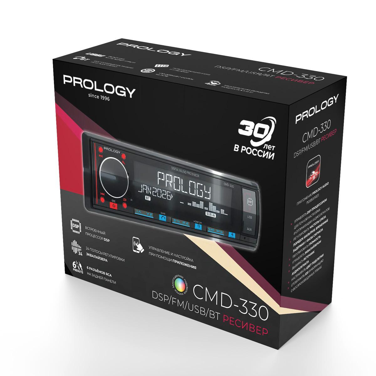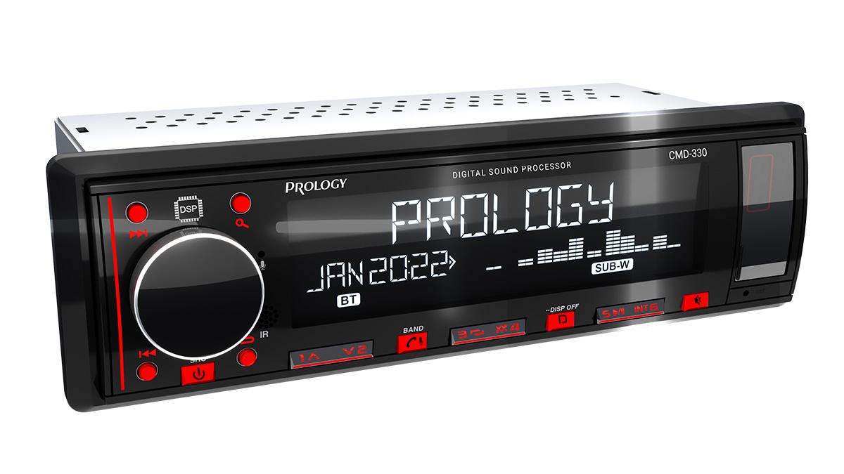 PROLOGY CMD-330 — FM / USB ресивер с Bluetooth® и встроенным DSP - аудиопроцессором, стандартного размера 1DIN, который обеспечивает прием радиостанций в диапазоне FM / УКВ / AM и воспроизведение медиафайлов MP3, WAV, и FLAC форматов, записанных на USB накопители, передачу звука с внешних источников через линейный аудиовход и беспроводной интерфейс Bluetooth®. Поддерживается управление мобильным телефоном через интерфейс Bluetooth® (ver. 4,2).