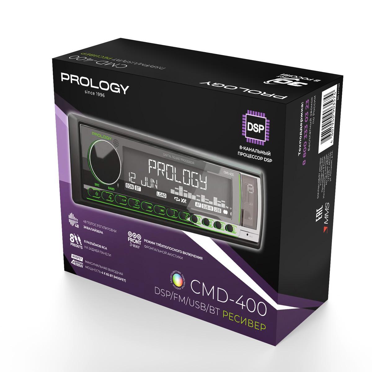 PROLOGY CMD-400 – FM/USB ресивер с Bluetooth® и встроенным 8-канальным аудиопроцессором DSP, стандартного размера 1DIN, который обеспечивает прием радиостанций в диапазонах FM/УКВ/AM и воспроизведение аудиофайлов MP3, WAV, и FLAC форматов, записанных на USB-накопители, передачу звука с внешних источников через линейный аудиовход и беспроводной интерфейс Bluetooth. Поддерживается управление мобильным телефоном через интерфейс Bluetooth® (ver. 5.1). Устройством можно управлять при помощи мобильного приложения Prology Audio, установленного на смартфон с операционной системой Android или iOS.