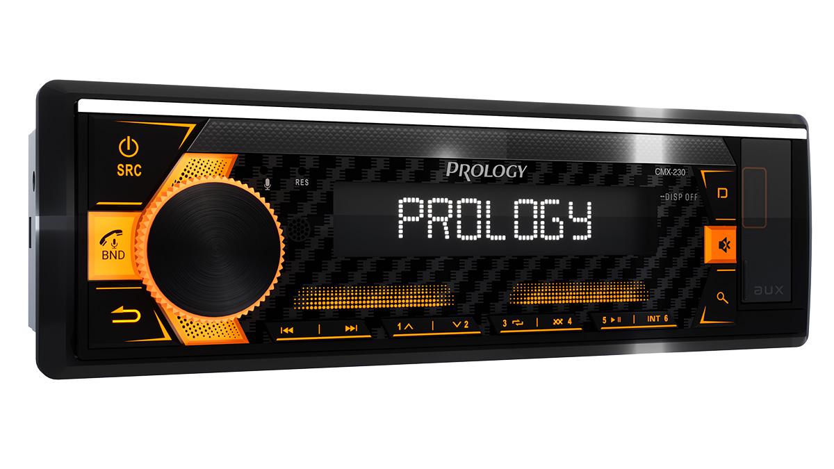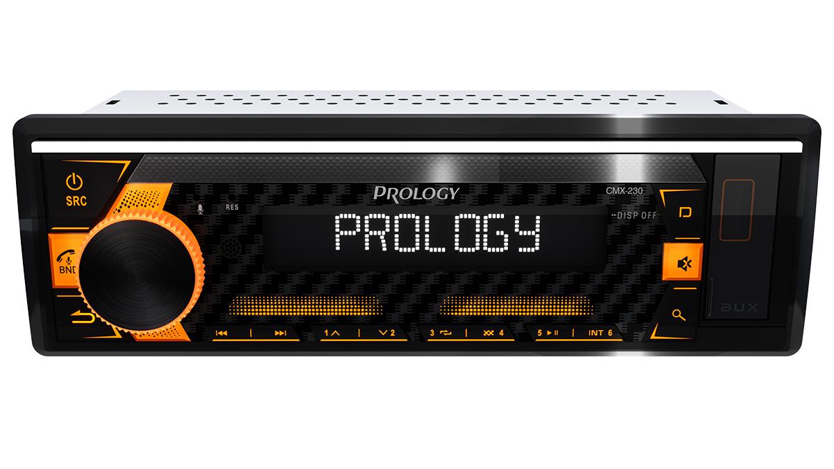 PROLOGY CMX-230 — FM / USB ресивер с Bluetooth®, стандартного размера 1DIN, который обеспечивает прием радиостанций в диапазоне FM и воспроизведение медиафайлов MP3, WAV, и FLAC форматов, записанных на USB накопители, передачу звука с внешних источников через линейный аудиовход и беспроводной интерфейс Bluetooth. Поддерживается управление мобильным телефоном через интерфейс Bluetooth® (ver. 4,2).