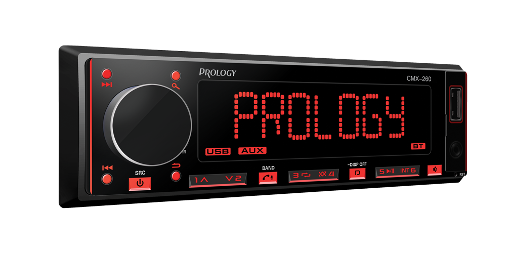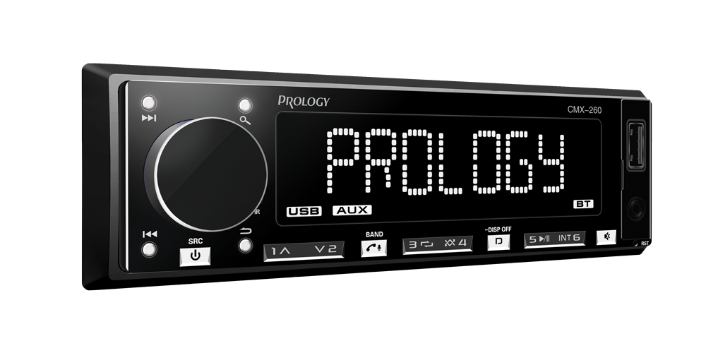 PROLOGY CMX-260 — FM / USB ресивер с Bluetooth®, стандартного размера 1DIN, который обеспечивает прием радиостанций в диапазоне FM и воспроизведение медиафайлов MP3, WAV, и FLAC форматов, записанных на USB накопители, передачу звука с внешних источников через линейный аудиовход и беспроводной интерфейс Bluetooth®. Поддерживается управление мобильным телефоном через интерфейс Bluetooth® (ver. 4,2).
