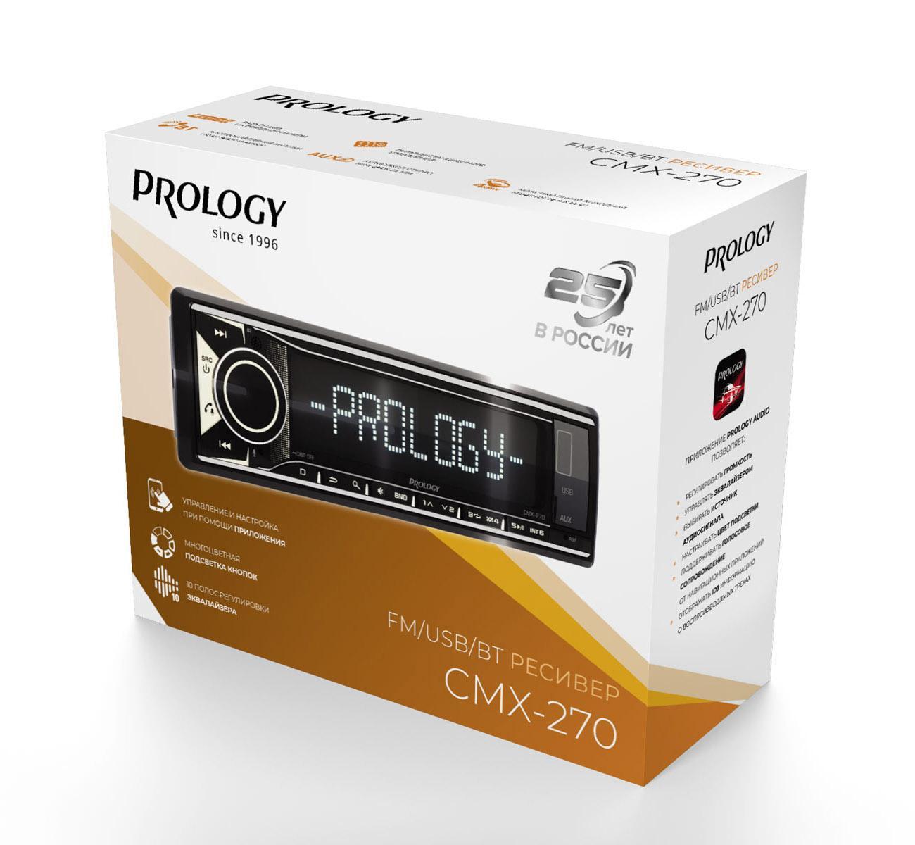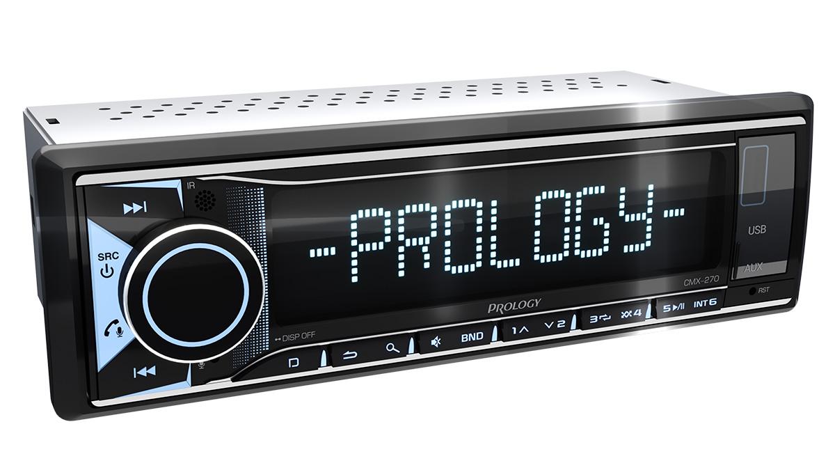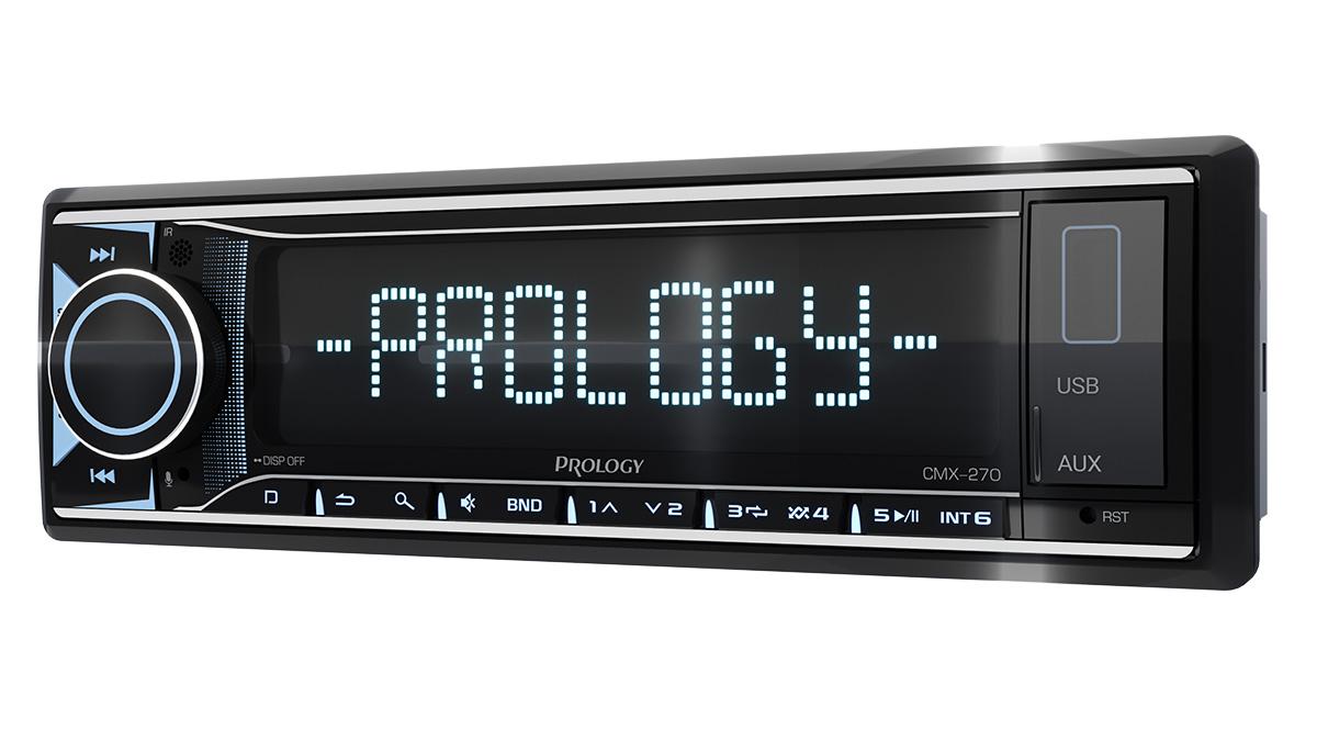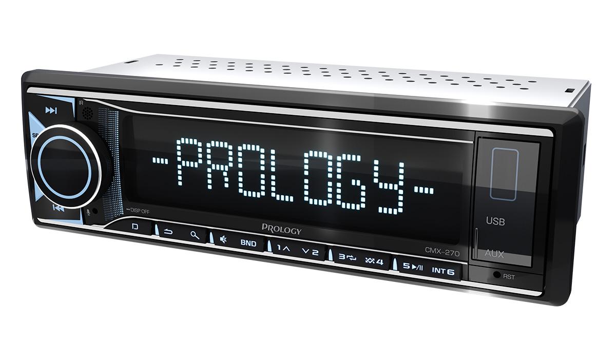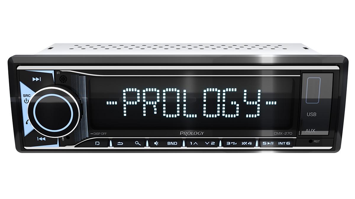 PROLOGY CMX-270 — FM / USB ресивер с Bluetooth®, стандартного размера 1DIN, который обеспечивает прием радиостанций в диапазоне FM и воспроизведение медиафайлов MP3, WAV, и FLAC форматов, записанных на USB накопители, передачу звука с внешних источников через линейный аудиовход и беспроводной интерфейс Bluetooth®. Поддерживается управление мобильным телефоном через интерфейс Bluetooth® (ver. 4,2).