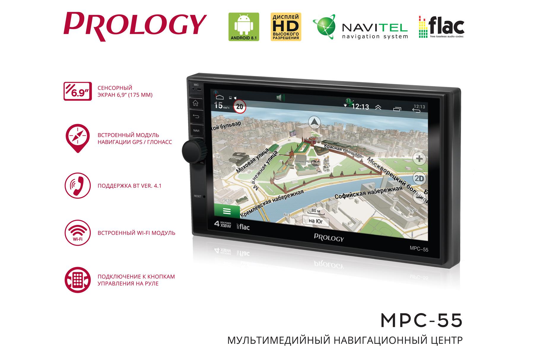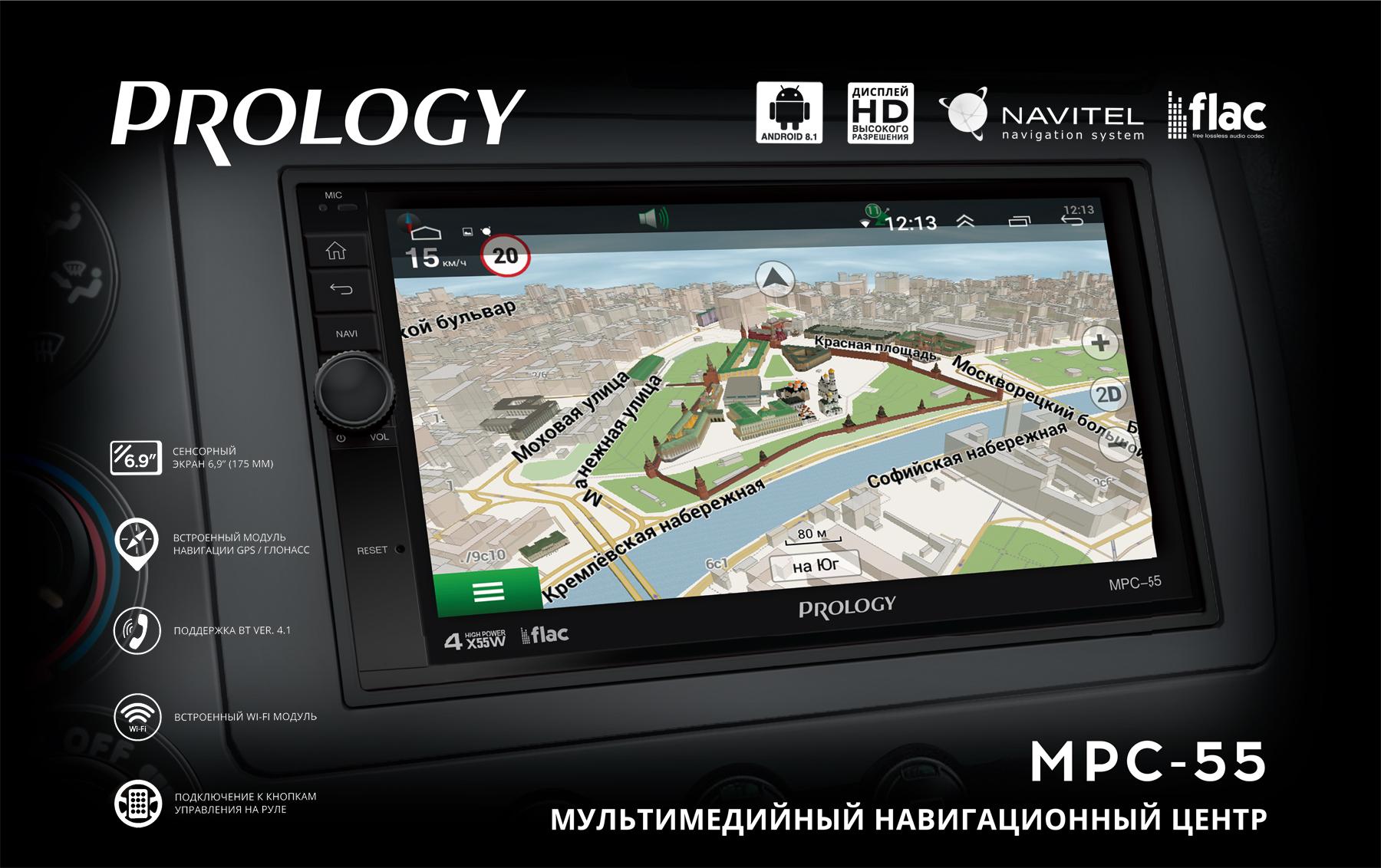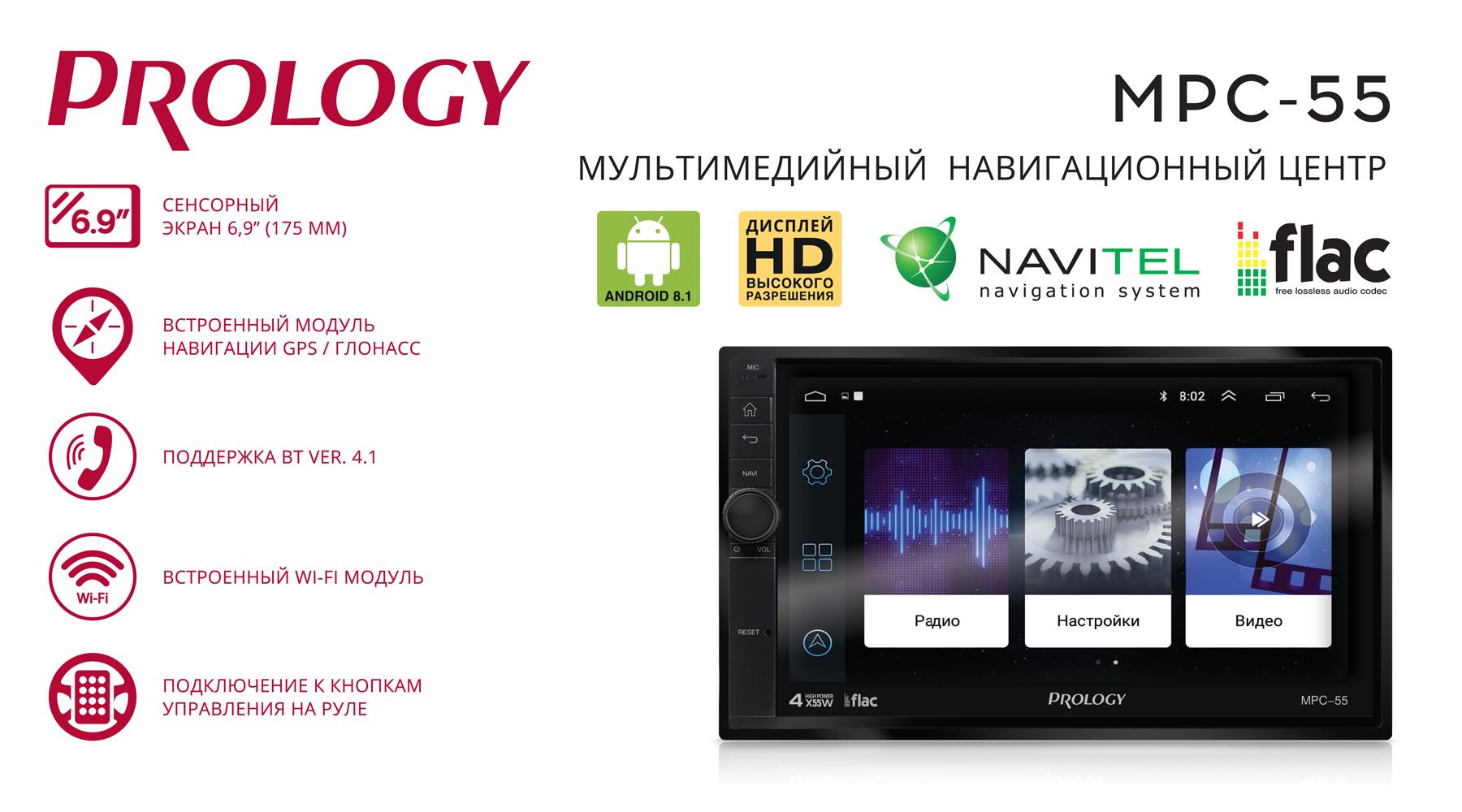 Мультимедийный навигационный центр PROLOGY MPC-55 на операционной системе ANDROID® 8.1 — это универсальная автомагнитола для стандартного монтажного размера 2DIN, которая позволяет пользователю принимать радиостанции в диапазонах FM/УКВ волн, воспроизводить самые популярные типы медиафайлов, записанных на карты памяти USB/microSD. Головное устройство PROLOGY MPC-55 обеспечивает работу с навигационным программным обеспечением Навител Навигатор, управление мобильным телефоном через интерфейс Bluetooth, работу c Интернетом посредством подключения к сети Wi-Fi, а также передачу звука с внешних источников.