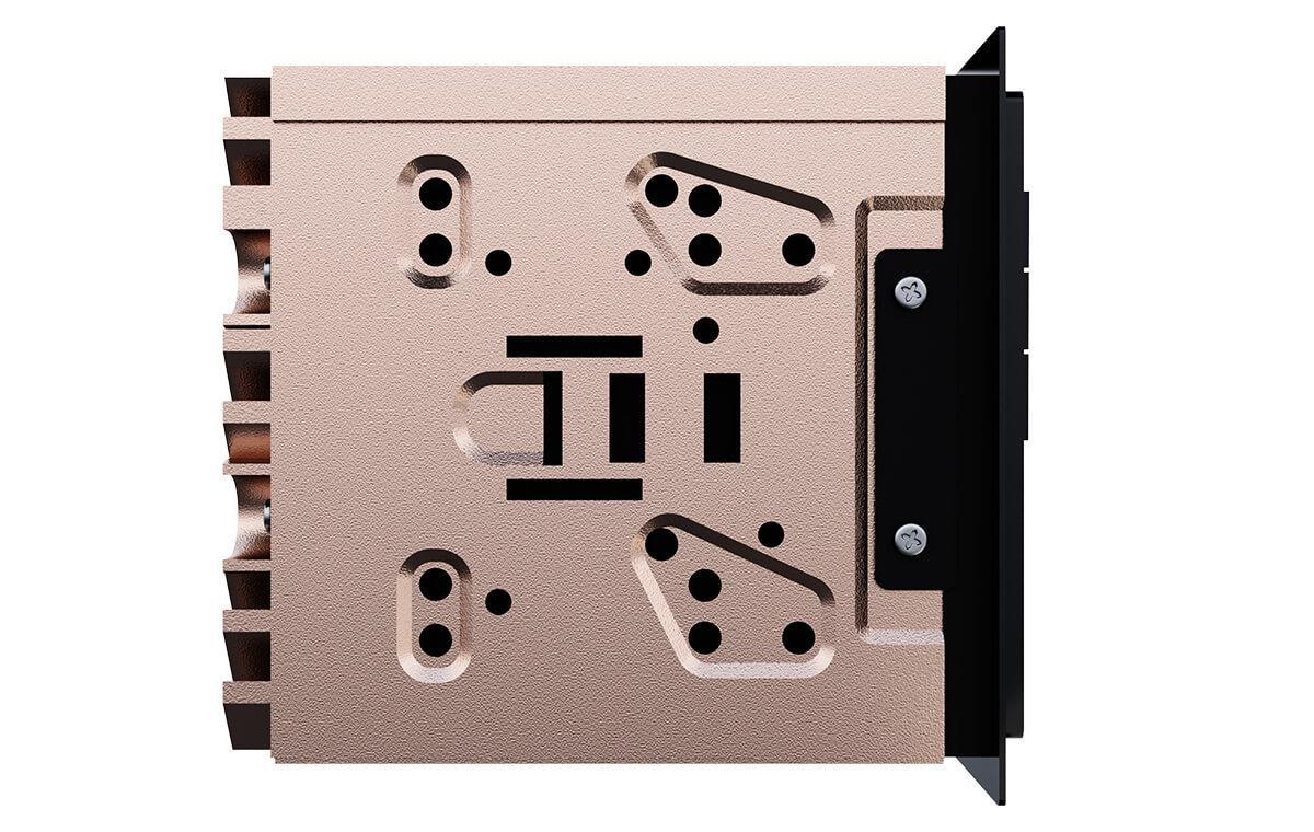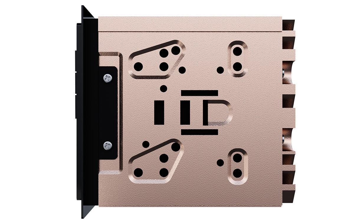 Заднюю сторону целиком занимает радиатор с внушительным количеством рёбер – дополнительное охлаждение мощному усилителю не помешает даже с учётом встроенной системы термозащиты (порог её срабатывания настраивается из меню). Главное, чтобы внутреннее пространство панели, куда ГУ будет установлено, позволяло реализовать улучшенное охлаждение.
