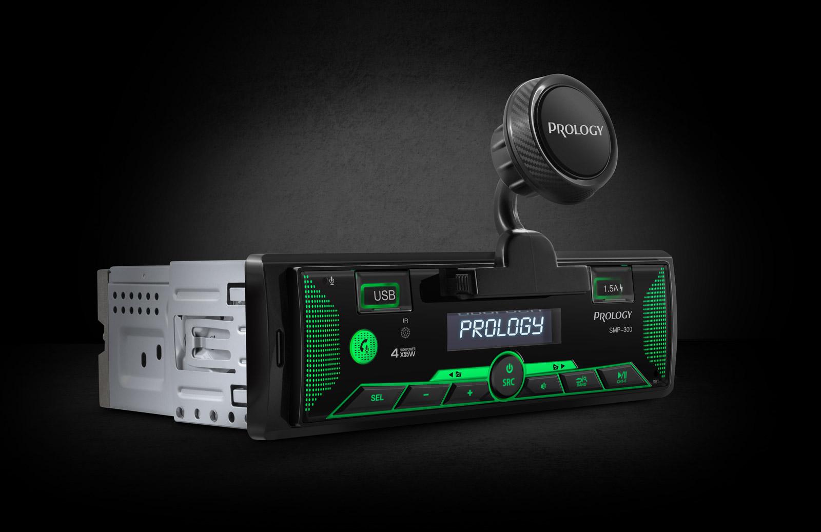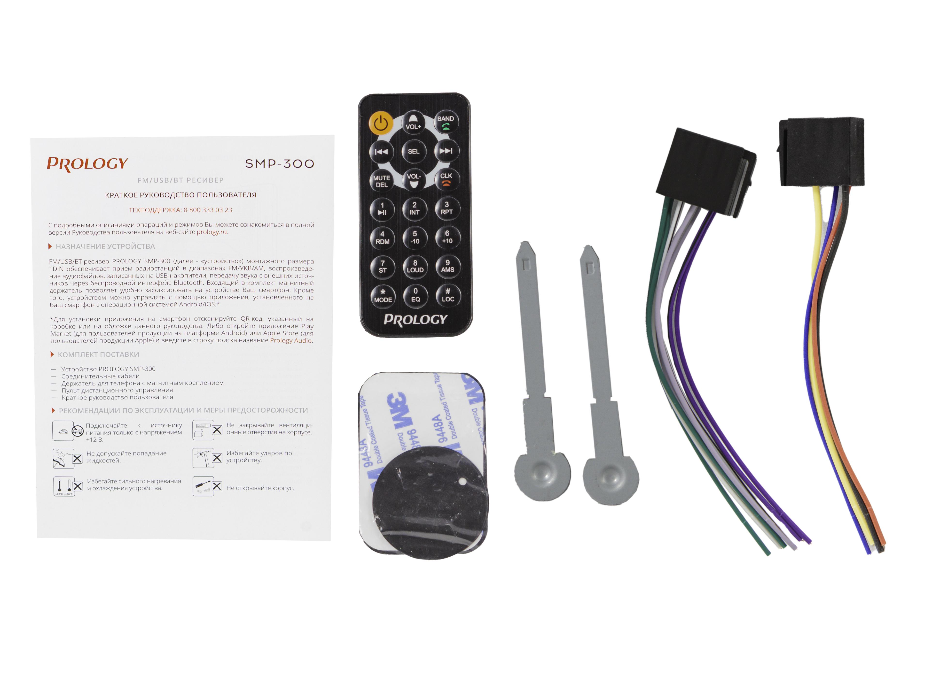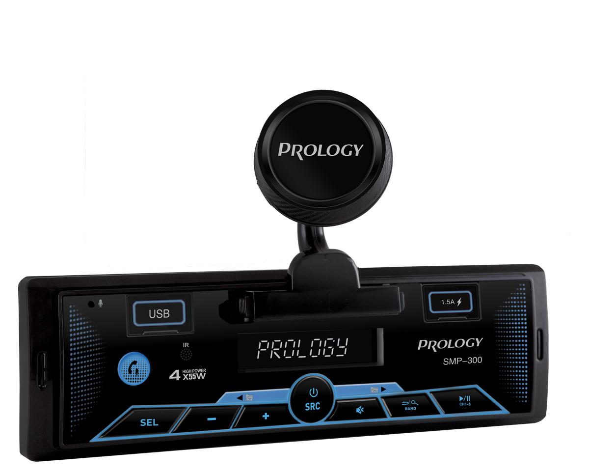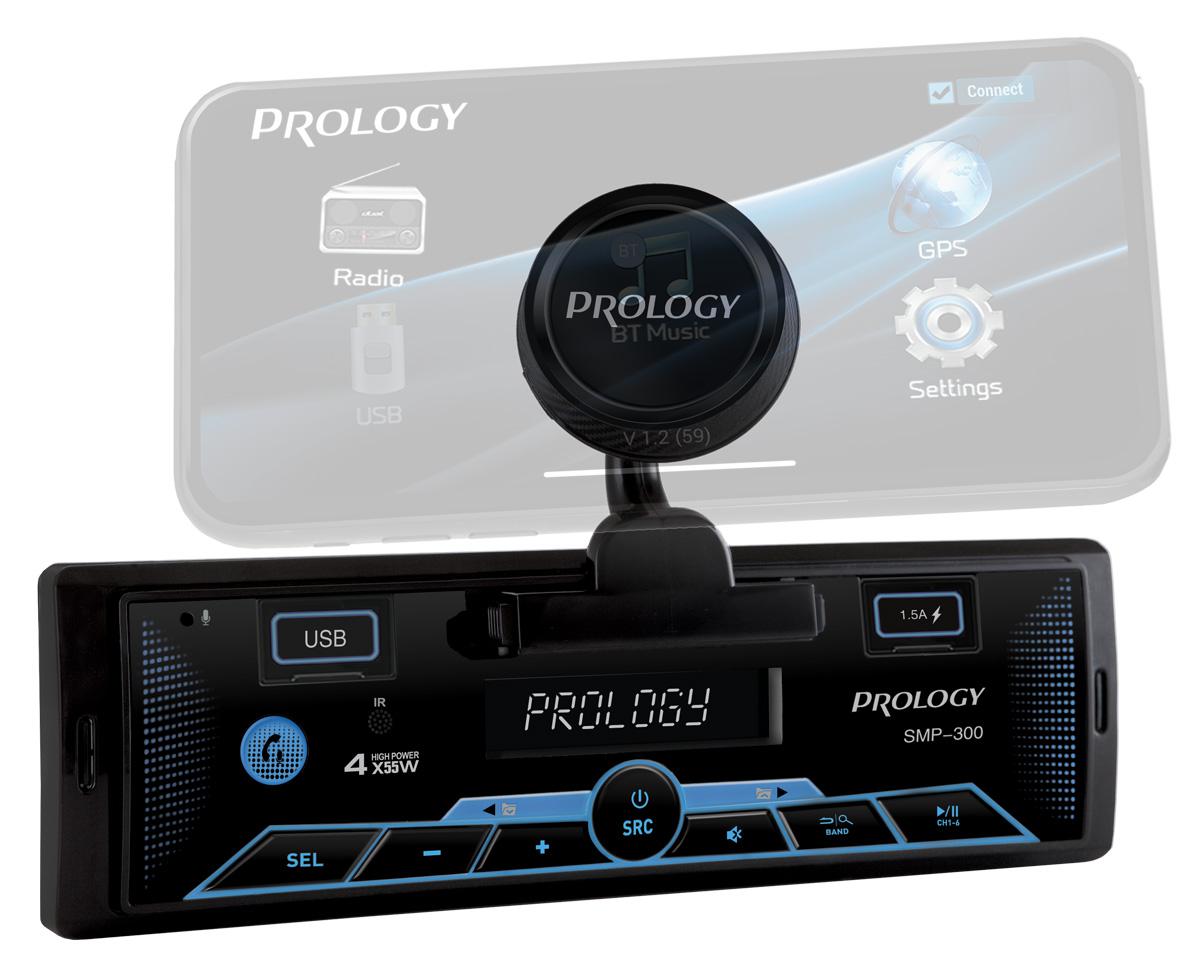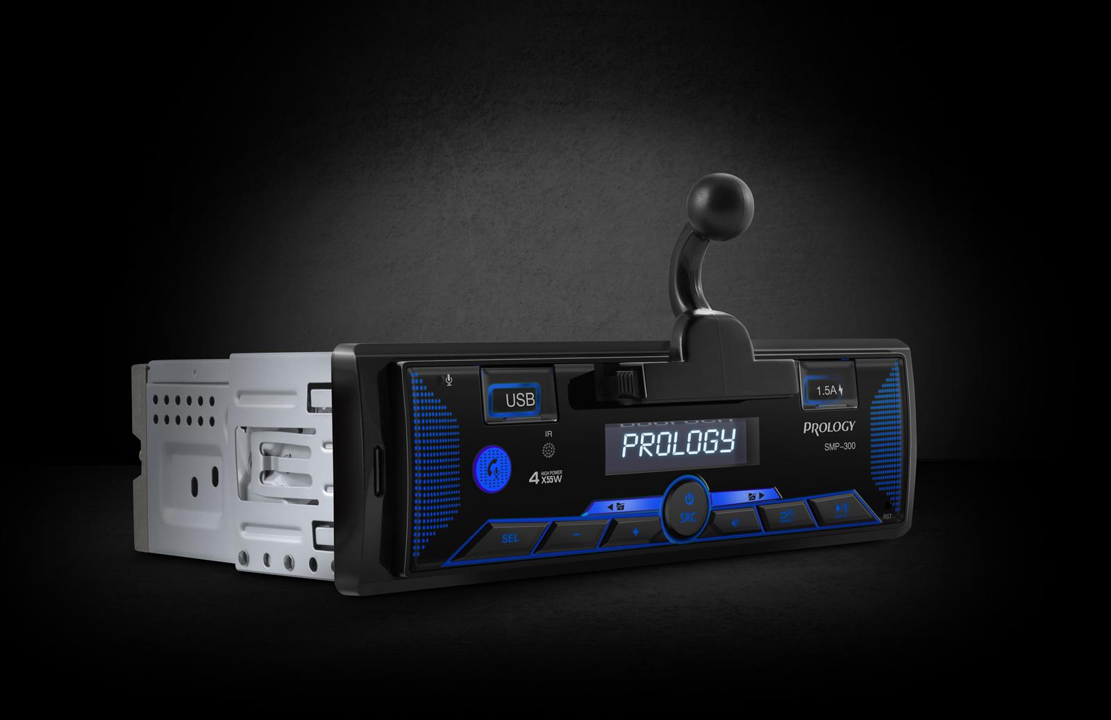 PROLOGY SMP-300 FM / USB ресивер с Bluetooth®, монтажного размера 1DIN, который обеспечивает прием радиостанций в диапазонах FM/УКВ/AM, воспроизведение аудиофайлов MP3, WAV, и FLAC форматов,, записанных на USB-накопители, передачу звука с внешних источников через беспроводной интерфейс Bluetooth® (ver. 4,2).